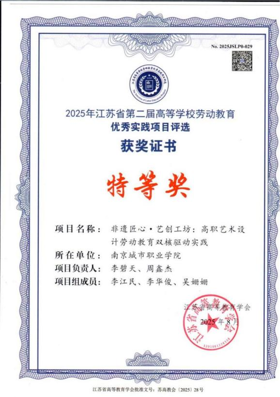 近日,从江苏省高等教育学会官网获悉,数字文创学院教师李碧天、周鑫杰、李江民(技能大师)、李华俊(技能大师)、吴姗姗申报项目《非遗匠心·艺创工坊:高职艺术设计劳动教育双核驱动实践》,在2025年江苏省第二届高等学校劳动教育优秀实践项目评选中荣获特等奖。