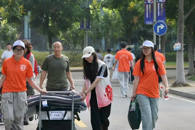 报到当日,校园内处处洋溢着热烈的迎新氛围。校领导专程亲临学院报到现场,不仅对迎新工作进行细致指导,还亲切慰问一线师生。倪杰校长格外关注家庭经济困难新生,特意为通过“绿色通道”入学的文创新生送上精心准备的大礼包,同时叮嘱同学们:“要不忘初心、珍惜时光、努力学习,在大学舞台上绽放属于自己的光彩。”现场,学院领导、辅导员及专任教师分工明确、密切配合,有序推进报到流程;志愿者们准时到岗,以饱满的热情为新生提供路线引导、搬运行李等服务,各站点运转高效顺畅。其中,负责统筹志愿服务工作的学生干部李佳楠同学,前一夜突发高烧,即便老师和同学多次劝说她休息,她仍强忍身体不适坚守在报到一线,用实际行动诠释着奉献精神,成为迎新现场一道动人的风景线。